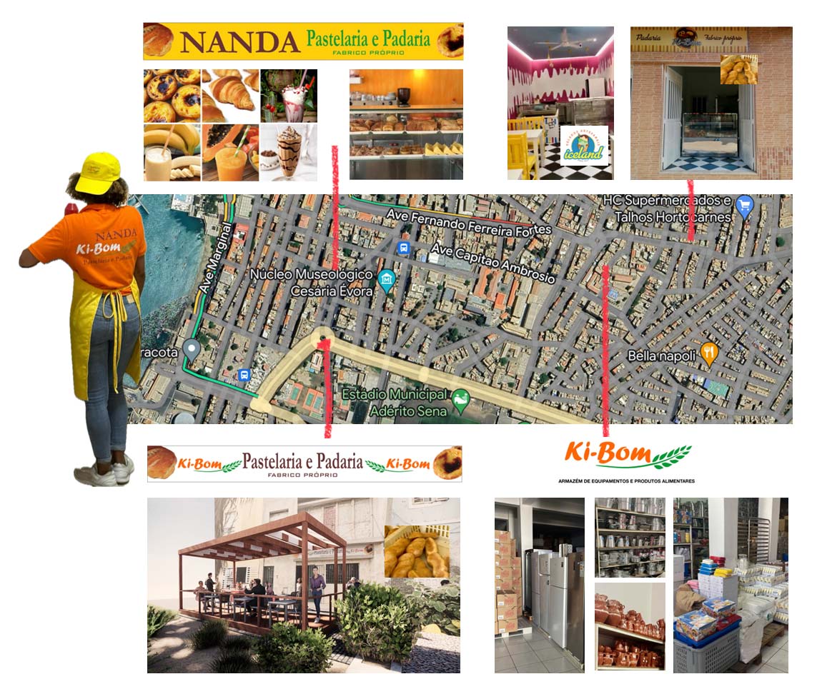 Na Rua de Coco a padaria e pastelaria Kibom com fabrico próprio de pão e bolos e em breve com uma esplanada,. É nesta mesma rua junto ao Tribunal que se encontra o segundo estabelecimento, a Nanda que serve deliciosa cachupa, bolos à fatia, iogurtes com fruta natural e os nossos Gelados Iceland.